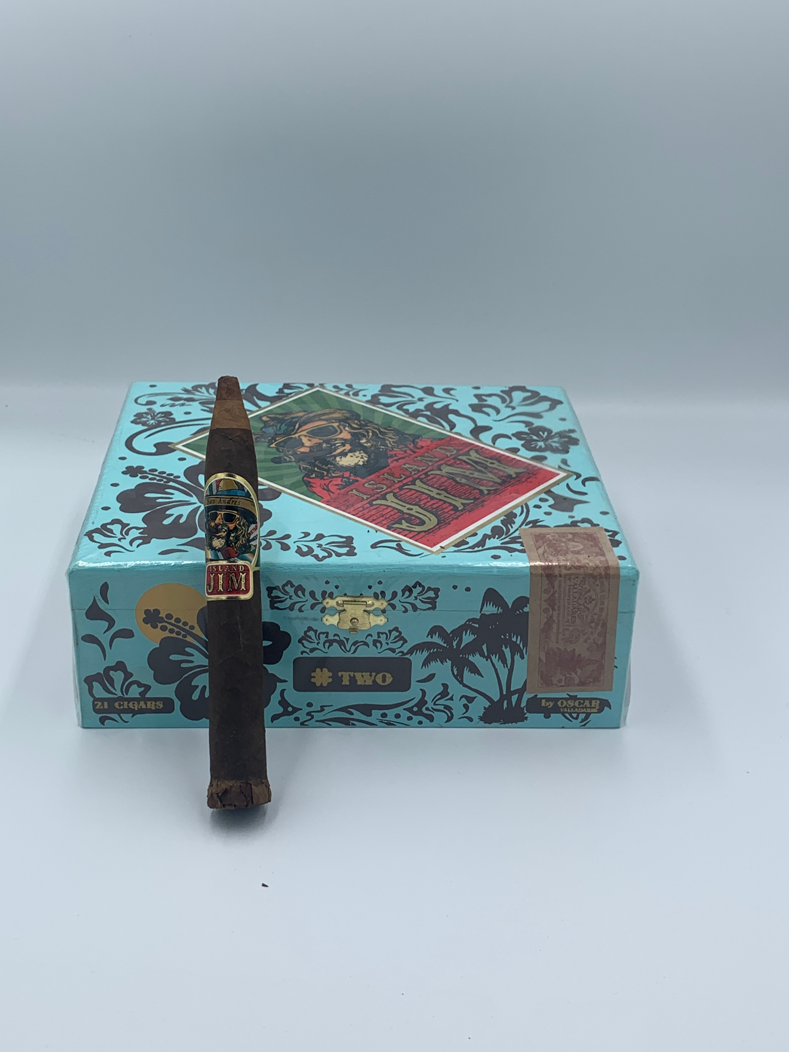 Crafted through the collaboration between Pittsburgh cigar shop owner Jim Robinson and renowned Honduran cigar maker Oscar Valladares, this cigar features multicolored pieces to the wrapper in a purposeful attempt to make it look like a pencil. The cigar is produced by Oscar Valladares Tobacco & Co. in Honduras, maintaining the brand's commitment to quality construction and innovative design. Despite its rugged appearance, Island Jim is actually an exceptionally well-crafted cigar rolled with precision, delivering a huge volume of smoke, an easy draw, and a razor-sharp burn.